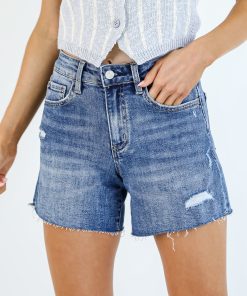 Meet your new weekend staple: the Eliza Medium Wash High-Rise Distressed Denim Shorts! With a flattering high-rise fit and perfectly placed distressing, these shorts bring just the right amount of attitude to your warm-weather wardrobe. The raw hems add an effortlessly undone touch, while the medium wash keeps things classic and versatile. Pair them with a tank, tee, or oversized button-down for that cool, carefree vibe all season long! Stretchy Medium Wash Denim Fabrication High-Waisted Button + Hidden Zipper Fly Closure Belt Loops Classic 5-Pocket Cut Relaxed Fit Distressed Raw Hems 97% Cotton, 2% Polyester, 1% Spandex Machine Wash Cold Inside Out, Tumble Dry Low Model is 5’6″ and wearing a Small.Garment Measurements in Inches:X-Small | Waist 26″ | Hips 34” | Length 12.5” | Inseam 4.5″Small | Waist 28″ | Hips 36” | Length 13” | Inseam 5″Medium | Waist 30″ | Hips 38” | Length 13.5” | Inseam 5″Large | Waist 32″ | Hips 40” | Length 14” | Inseam 5″X-Large | Waist 34″ | Hips 42” | Length 14.5” | Inseam 5.5″